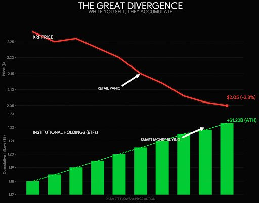 The lower panel of the chart below shows this divergence, showing total holdings of Spot XRP ETFs climbing steadily even as the price moved lower. This contrast can be described as a transfer of wealth in plain sight, showing how institutional buyers were using the pullback to add exposure when retail traders were selling.