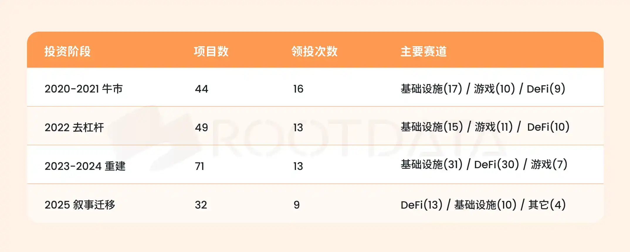 In terms of sector selection, the most obvious change is the退潮 of gaming—from 10 deals in the bull market period to 7 deals in 2023–2024, to基本 disappearing in 2025; DeFi has continued to strengthen, becoming YZi Labs' most favored sector for the first time in 2025. Infrastructure is its core logic, never absent regardless of bull or bear markets; Sui, Aptos, Movement, etc., fall into this category.