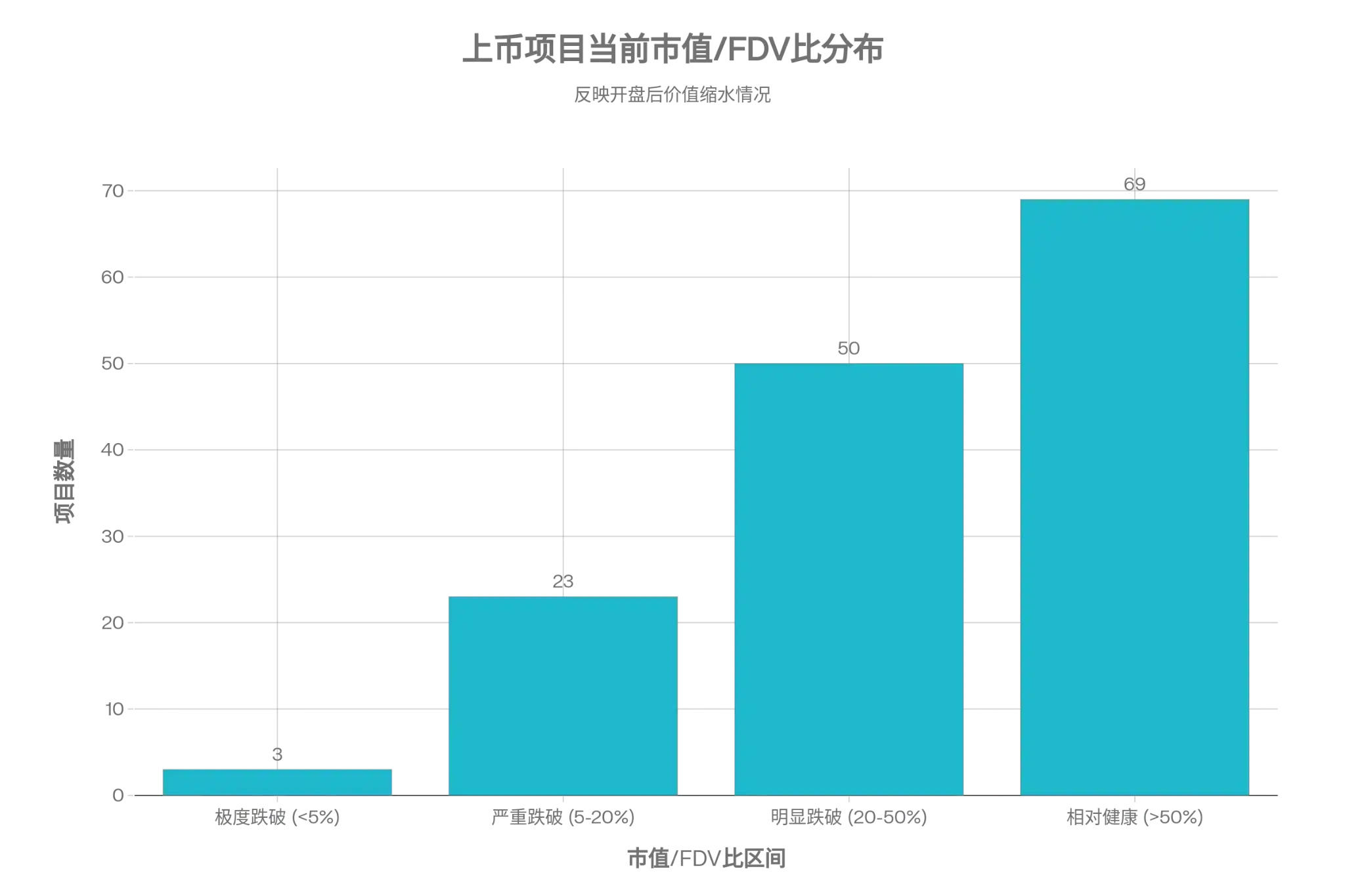 A significant divergence between market cap and FDV is common among projects with high FDV listings, a共性 phenomenon in this cycle's crypto market. Among the 152 projects tradable on exchanges, 76 (50%) have a current market cap below 50% of FDV, and 26 (17.1%) have a market cap/FDV ratio below 20%.