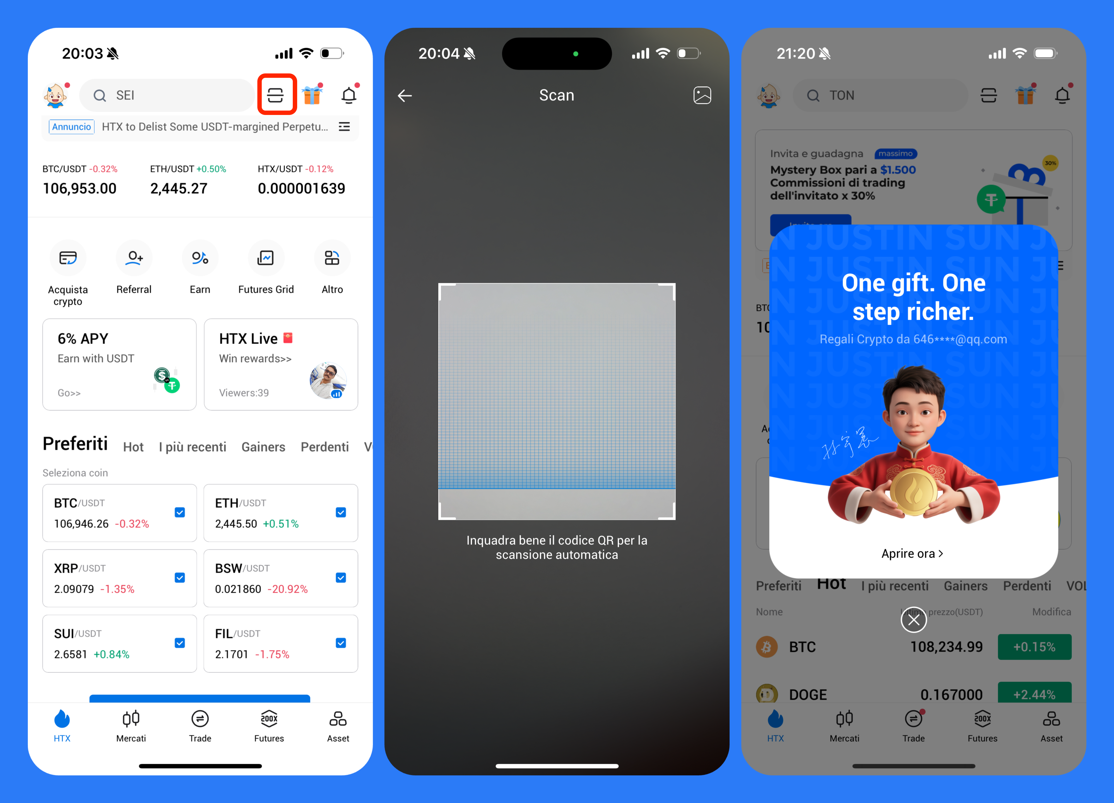 Sia gli utenti HTX nuovi che quelli esistenti possono ricevere i Regali Crypto sulla nostra app o tramite qualsiasi browser, usando il codice, link o poster ricevuto.