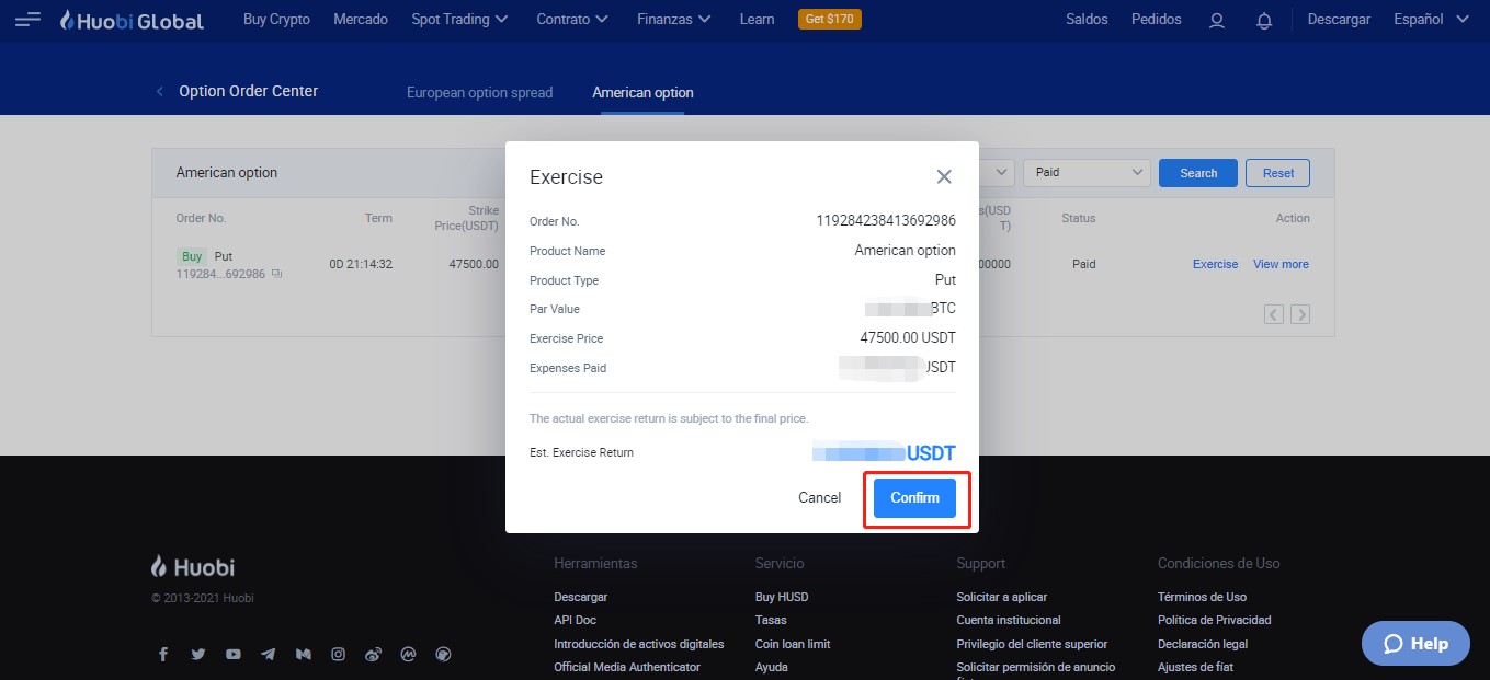 L'utente può attendere la scadenza del prodotto e il contratto di Option verrà automaticamente esercitato e liquidato. Nello stesso tempo, le HTX Options possono essere esercitate in anticipo. Nella pagina Contratti aperti, gli utenti possono cliccare su "Esercitare" per esercitare in anticipo le Option per la liquidazione. Il sistema calcolerà il rendimento atteso in base al prezzo corrente dell'attività sottostante.