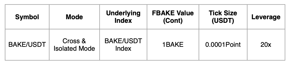 HTX will be launching BAKE/USDT perpetual futures at 10:00 (UTC) on December 22, 2023. The conditions for USDT-margined futures are as follows:
