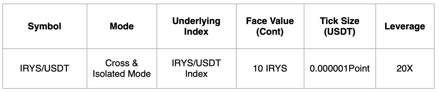 HTX has launched IRYS/USDT perpetual futures, which supports 1-20x leverages for long and short trades.
