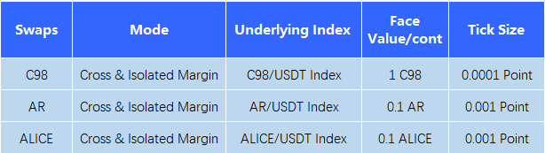 HTX Futures will launch C98/USDT Swaps, AR/USDT Swaps, and ALICE/USDT Swaps at 6:00 am on Sep. 7, 2021 (UTC). Using stablecoin USDT as the margin currency, these swaps support bi-directional trading. The corresponding elements of these USDT-margined swaps are as below: