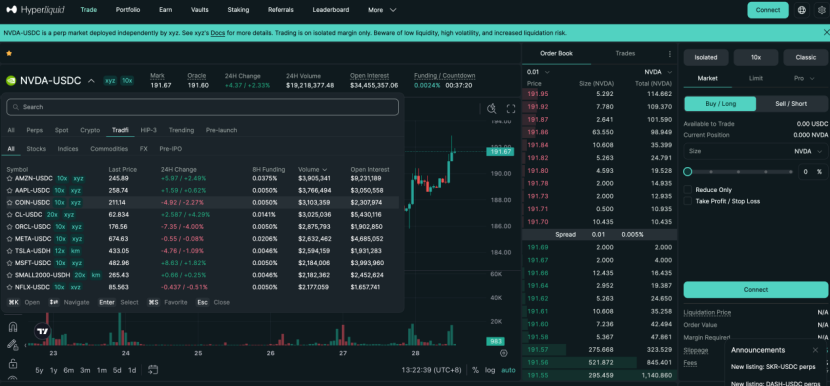 Lighter’s core proposition is its zk‑rollup provable matching system, where all trades and liquidations can be verified on‑chain via zero‑knowledge proofs, emphasizing transparency and fairness. Its equity perpetual futures currently support 10 U.S. stock tickers with a uniform leverage cap of 10x, reflecting a more conservative risk management stance. Its liquidity profile shows concentration at the top — COIN (Coinbase) often exceeds $10 million in daily volume, while NVDA and other mid‑tier names show moderate volume but relatively high open interest, suggesting the presence of medium‑to‑long‑term strategy capital. Lighter balances user experience with a simplified front end for easy onboarding, combined with a professional order book under‑the‑hood, satisfying the needs for professional execution.