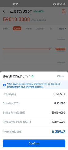 Anda boleh membeli panggilan, atau put mengikut situasi pasaran. Masukkan amaun matawang berkaitan dengan kontrak opsyen (unit: BTC atau matawang lain). Sistem menghitung perbelanjaan yang perlu dibayar untuk membeli kontrak opsyen itu. Klik Call atau Put untuk membeli kontrak opsyen.