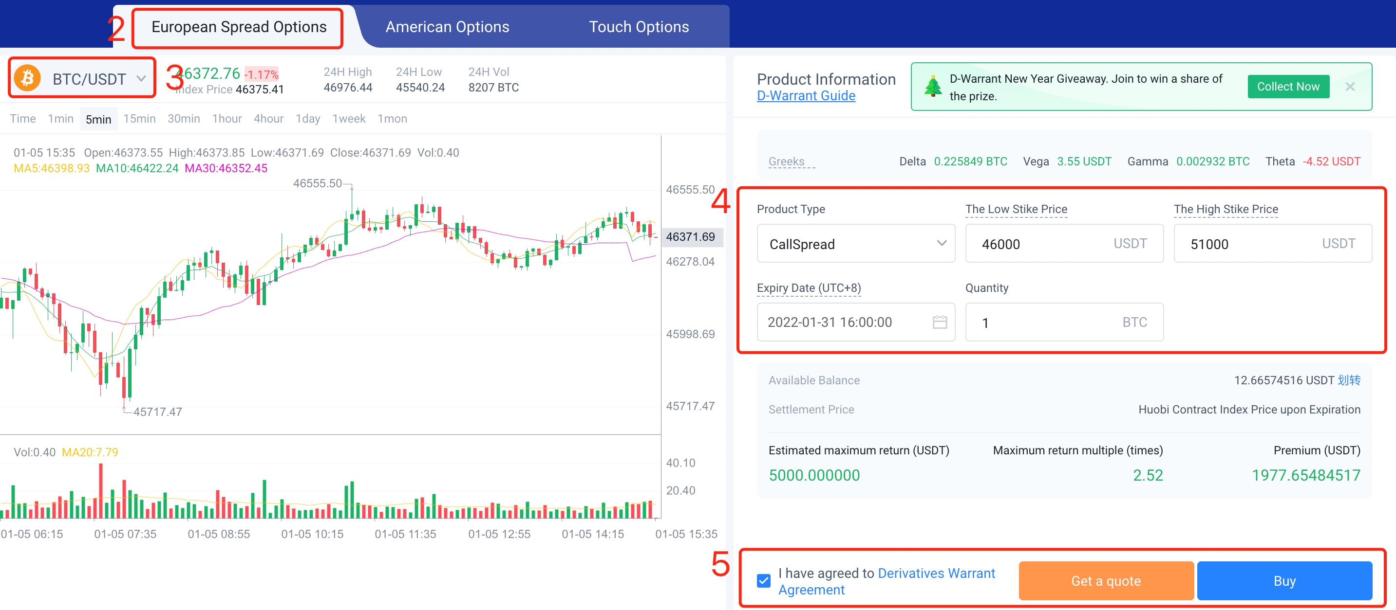 5. Tandakan pada kotak untuk bersetuju dengan “OptionsAgreement”, klik "Get a quote" untuk mendapatkan harga tawaran untuk kontrak opsyen itu. Jika anda fikir bahawa ia adalah satu tawaran yang baik, klik “Buy” untuk membeli kontrak opsyen itu.