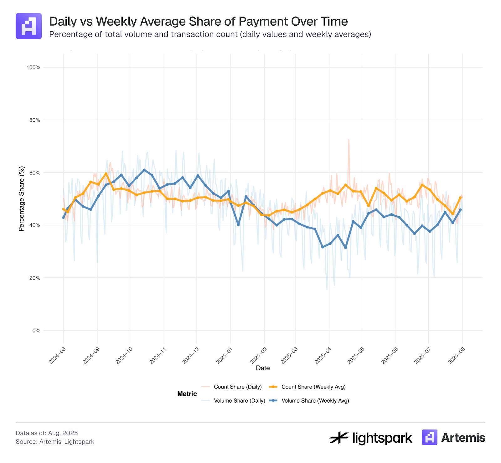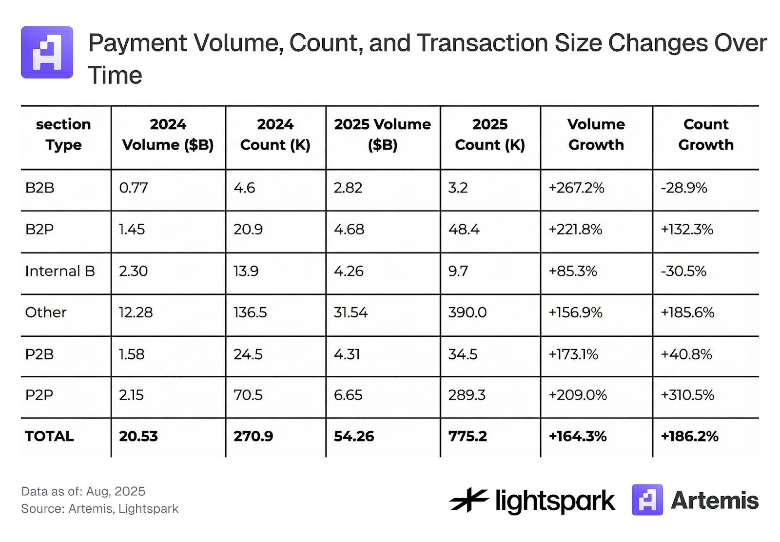 Figure 5, focusing on weekly changes, shows a consistent adoption trend and growth in weekly transaction volume across all categories. Table 4 further summarizes the overall changes from August 2024 to August 2025.