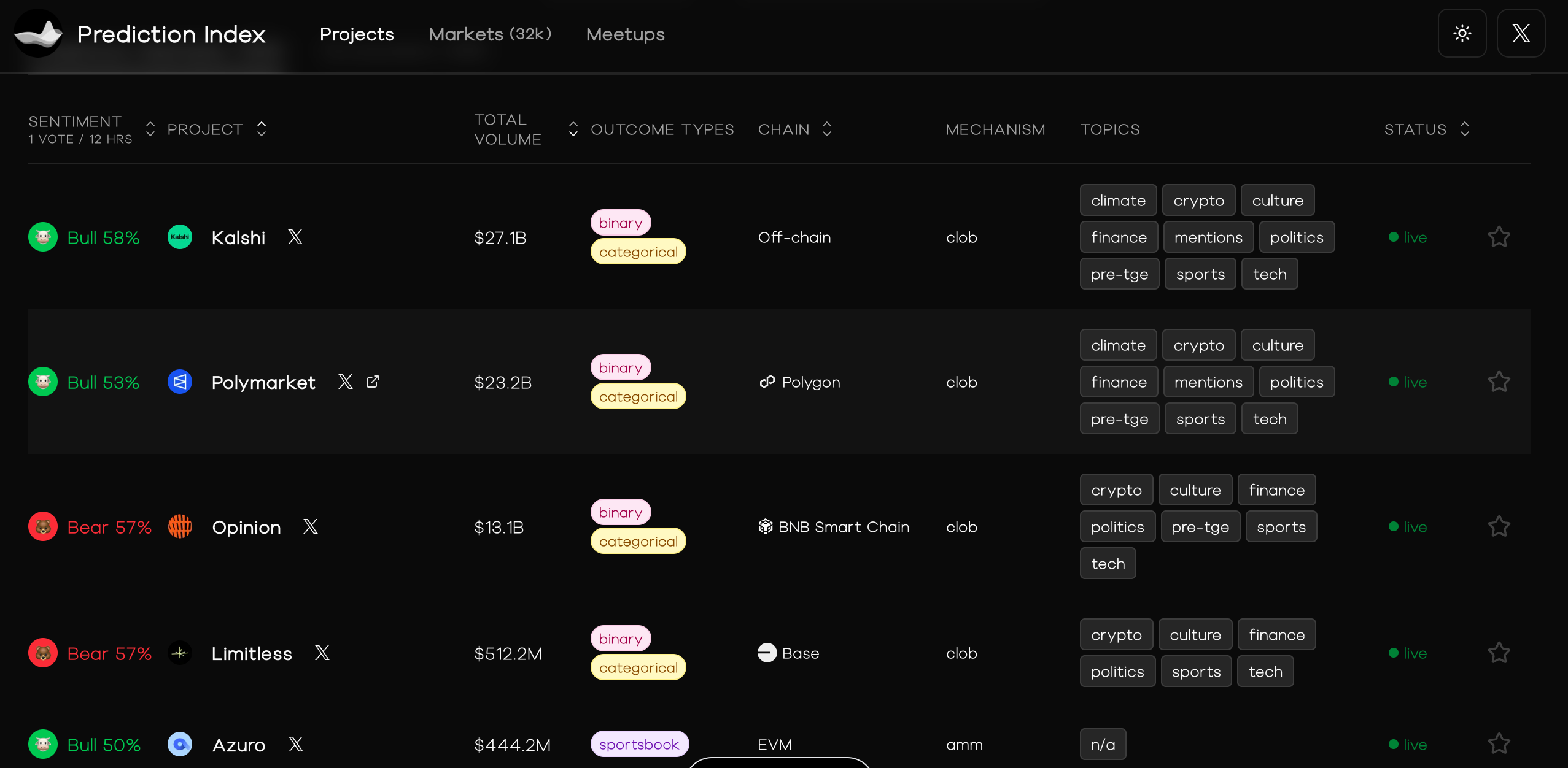 - This long-tail market is crucial for testing and evolving new market designs, incentives, and ideas, involving projects such as azuroprotocol, TrendleFi, hyperstiti0ns, Limitless, MyriadMarkets, overtime, footballdotfun, xodotmarket, predictonfliq, DGbet_official, and BRKTgg.