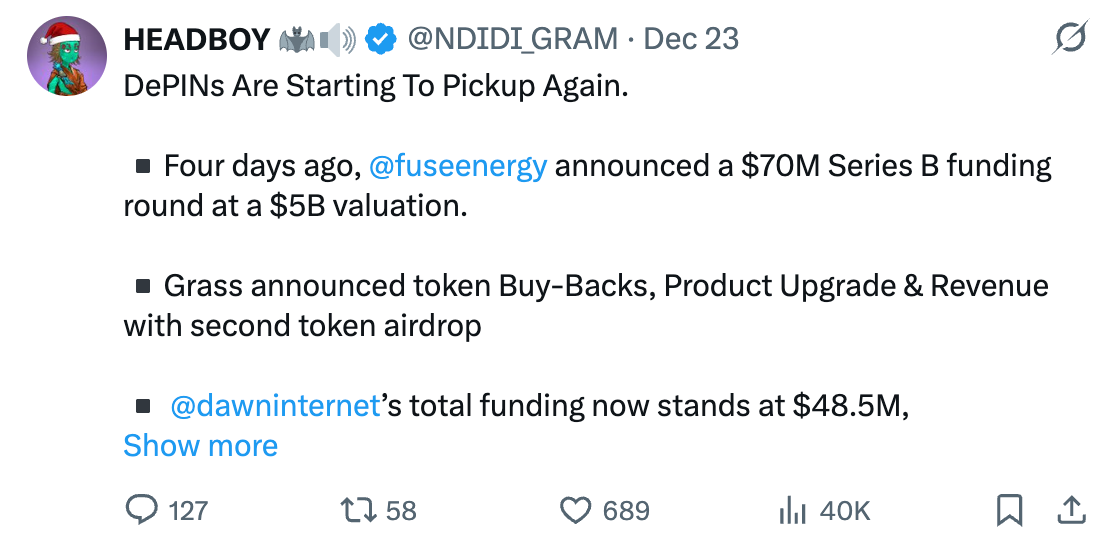 We witnessed the rise of Decentralized Physical Infrastructure (DePINs) in 2024, followed by a sharp decline in 2025. However, I believe next year will be the time for its full potential to be unleashed.