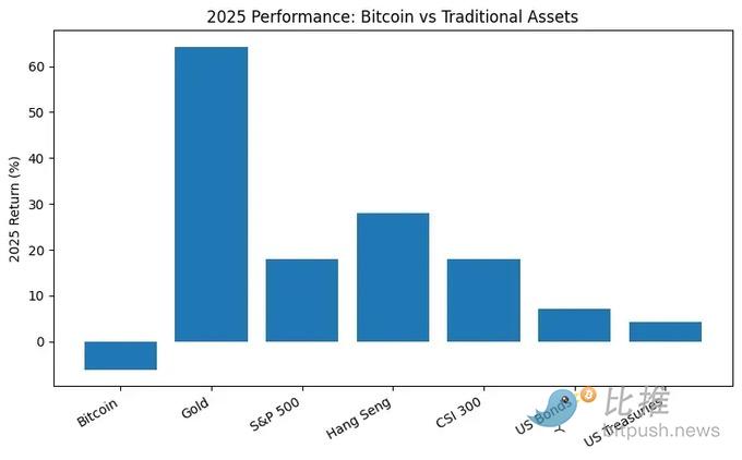 On a cross-asset level, even against a backdrop of policy friendliness and institutional红利释放, BTC明显 underperformed gold, U.S. stocks, Hong Kong stocks, A-shares, and other major TradFi assets in 2025, making it one of the few assets that failed to同步创出 new highs alongside global risk assets.