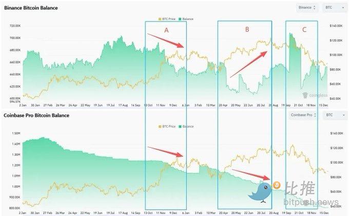 Coinbase BTC Balance continued to decline during the cycle, reducing the available selling筹码 on the CEX side. In contrast, Binance Balance significantly increased during phases B and C as prices rebounded, corresponding to increased potential selling pressure from offshore spot.