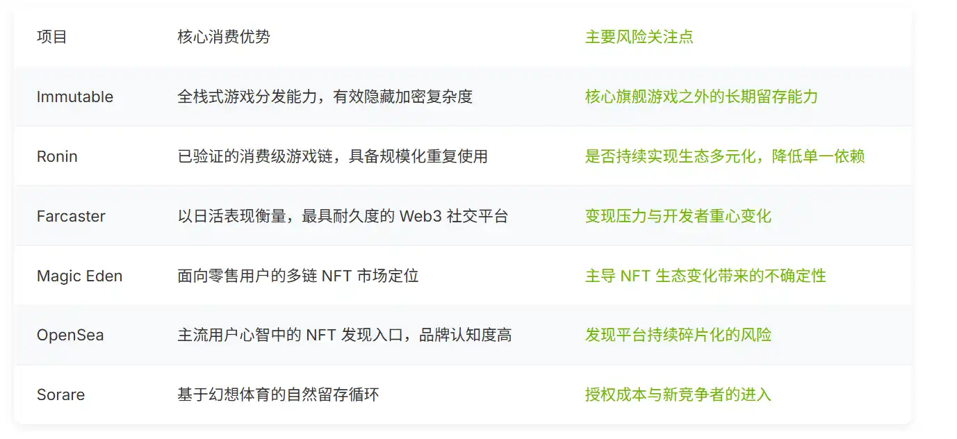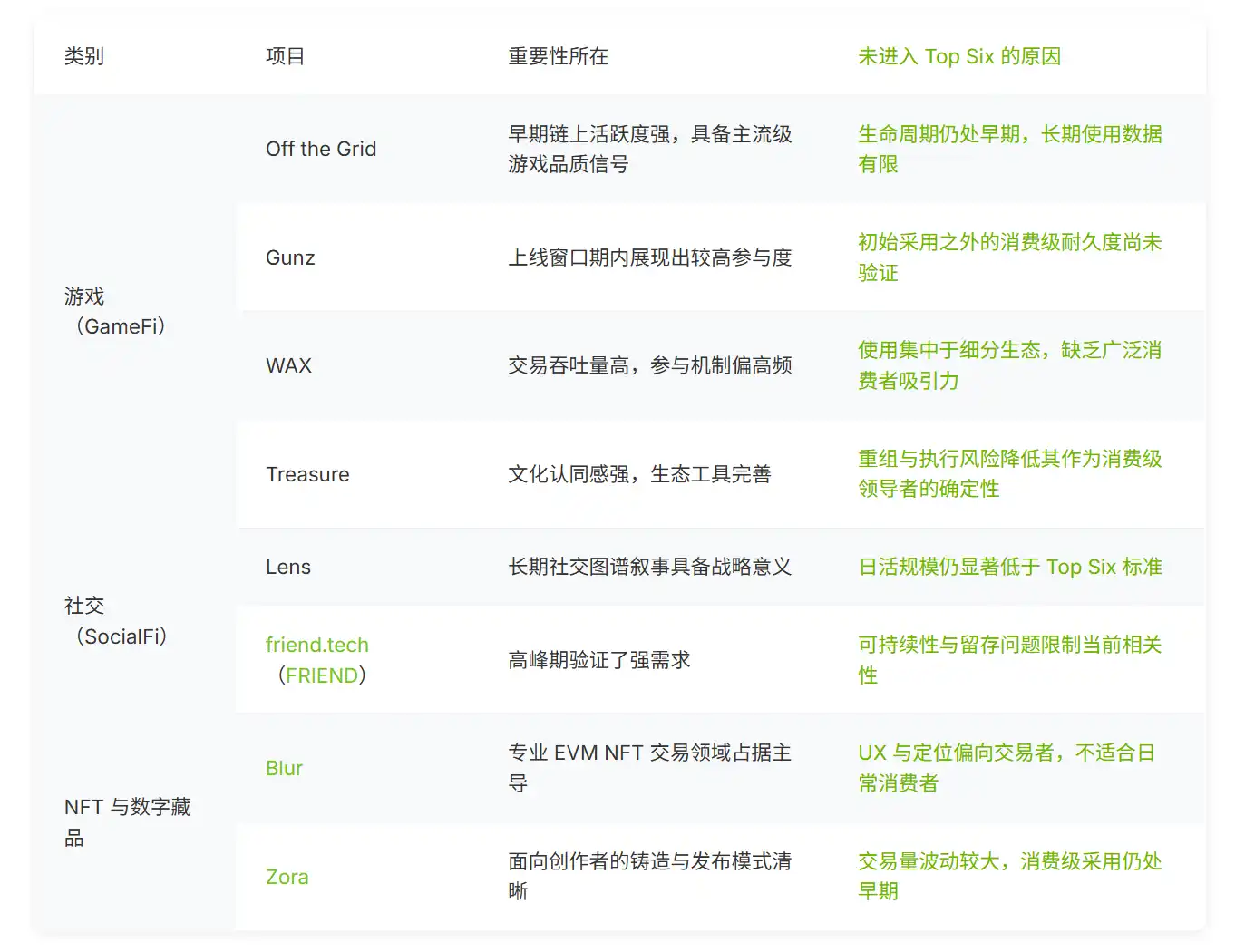 同样重要的是,本榜单刻意未纳入的指标。代币价格表现、短期激励计划、缺乏使用验证的宏大路线图,以及仅具基础设施意义但缺乏消费者牵引力的项目,均不在评估范围之内。