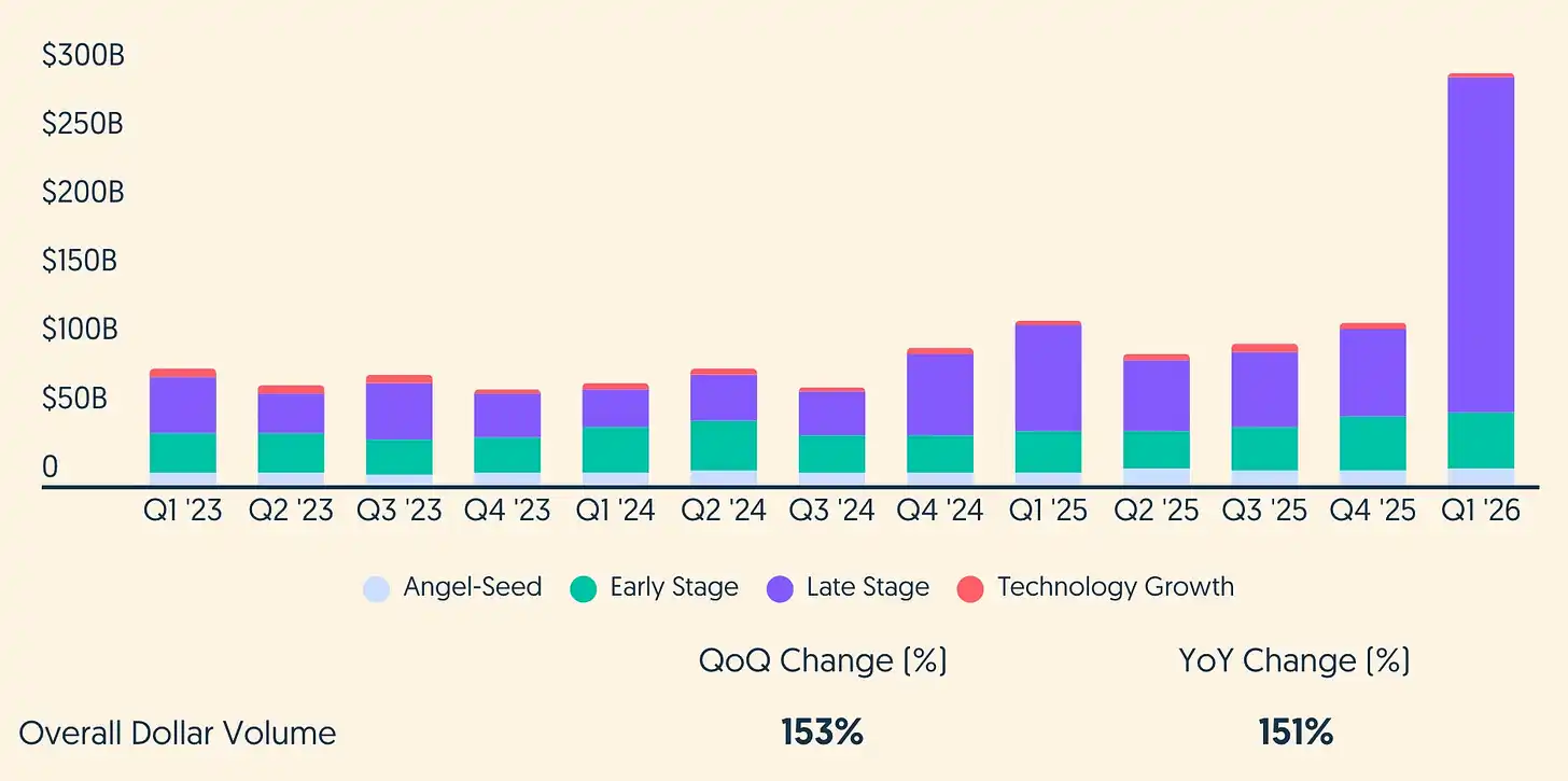 Crunchbase data shows global VC funding in Q1 2026 was approximately $300 billion, covering about 6,000 startups, with both quarter-on-quarter and year-on-year growth exceeding 150%. This figure is close to 70% of the total VC funding for the entire year of 2025.