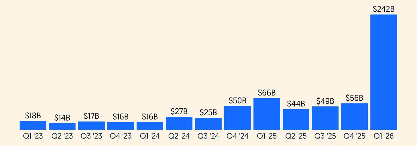 AI's dominance in Q1 2026 cannot be ignored. Crunchbase estimates AI-related companies raised approximately $242 billion, accounting for 80% of global VC funding. For comparison: in Q1 2025, AI funding was about $59.6 billion, representing 53% of that quarter's total. Even considering database backfilling and definition drift, the direction is clear: AI has gone from the largest vertical to, on a funding-weighted basis, the venture capital market itself.