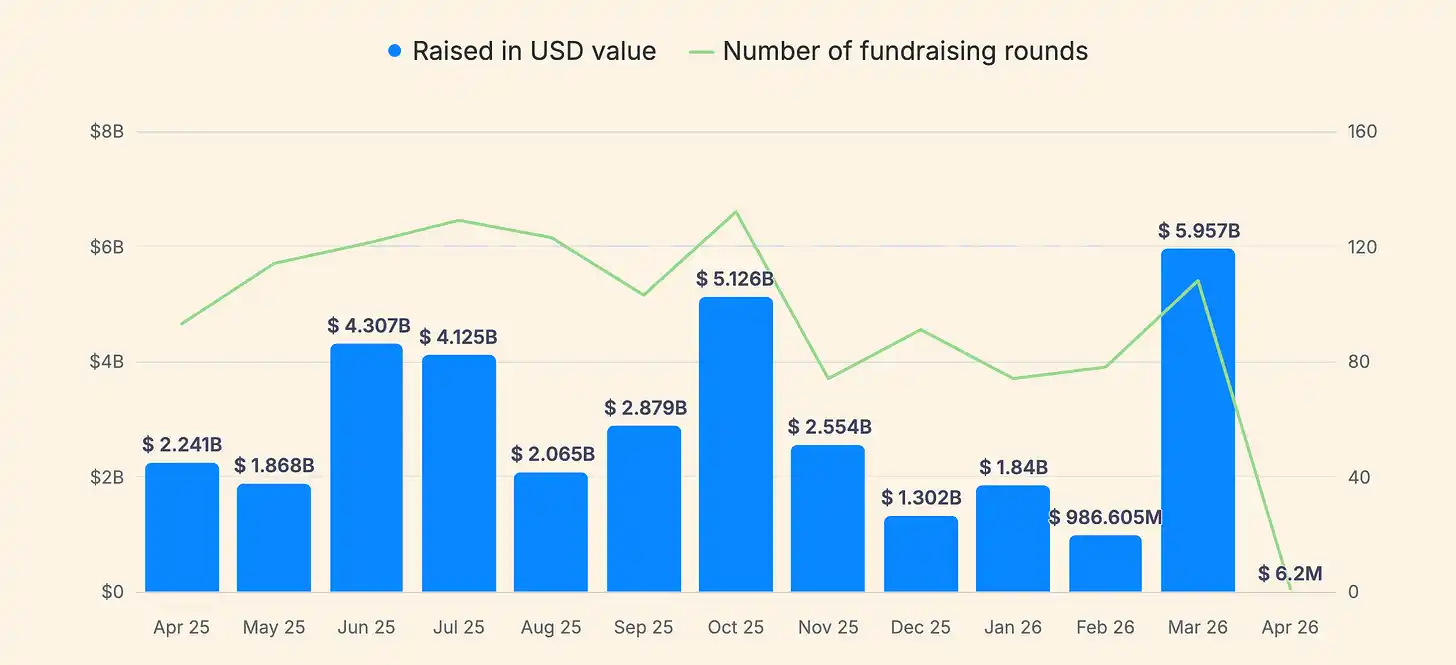 For specialized investors, crypto and digital assets were the second most relevant theme in Q1 2026, but the absolute scale is much smaller than AI. In crypto-specific funding trackers, Q1 2026 funding is typically in the high single-digit billions of dollars, with high monthly volatility. CryptoRank data shows 252 funding rounds in Q1, totaling $8.632 billion. March alone contributed approximately $5.95 billion (107 rounds), meaning about two-thirds of Q1 crypto VC funding occurred in the final month.