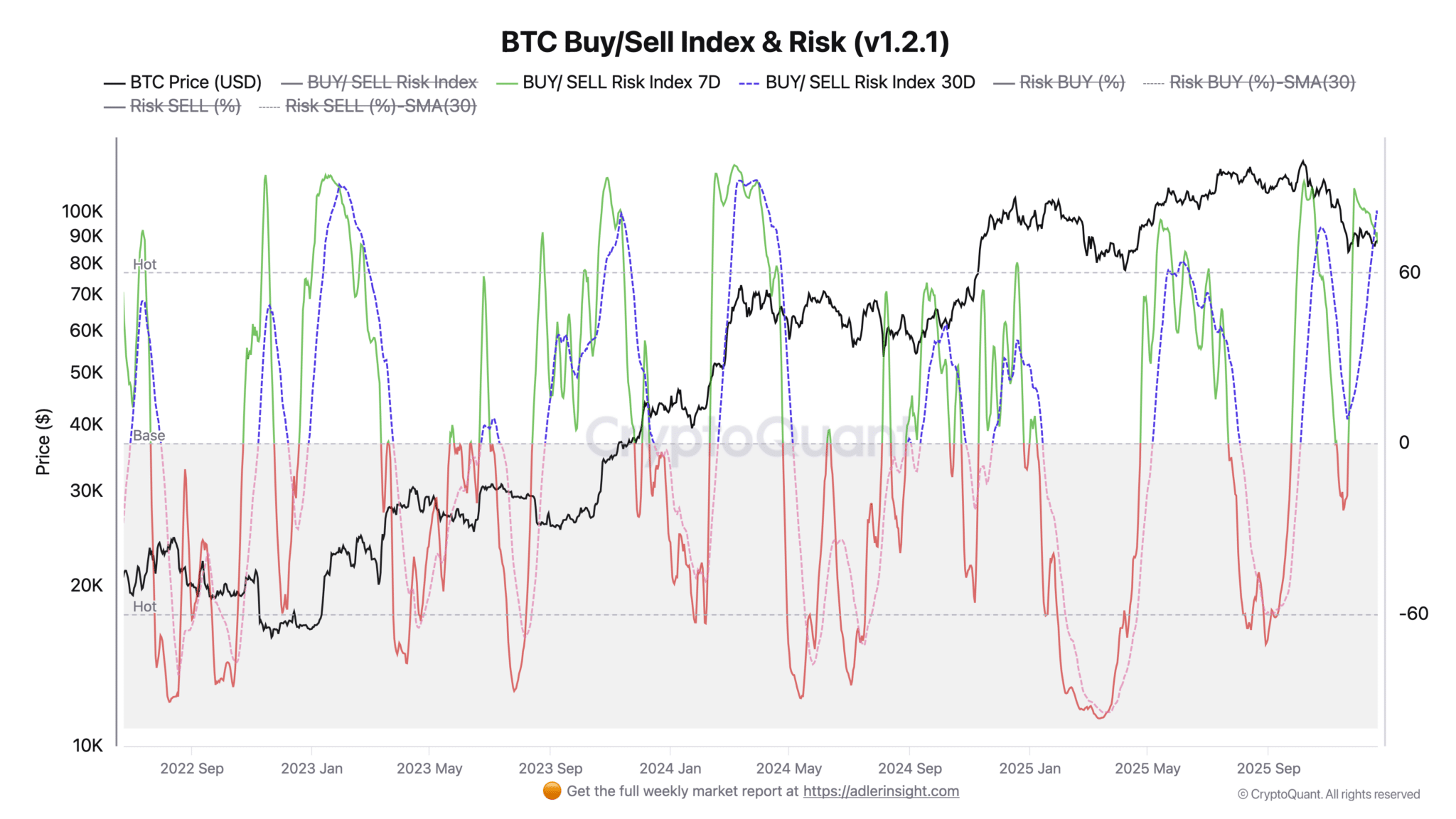 尽管留存率指标传递出积极信号,但交易员和投资者仍需密切关注当前市场格局。加密货币分析师阿克塞尔·阿德勒·小(Axel Adler Jr)指出,根据买卖指数的数值(1日、7日及30日),当前市场对买家而言仍存在较高风险。