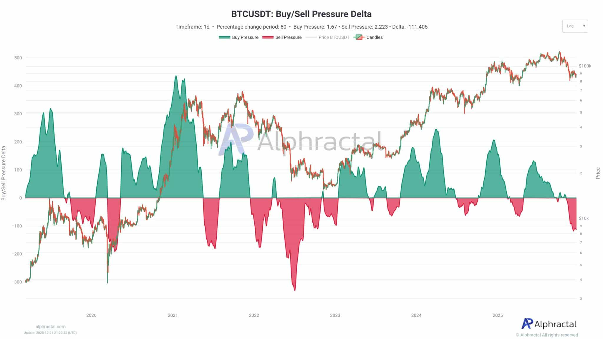 一位知名链上分析师表示,比特币(BTC)目前正遭遇近三年来最猛烈的抛售压力。事实上,分析平台Alphractal的创始人兼首席执行官若昂·韦德森(Joao Wedson)在X平台的一篇帖子中,展示了不断走低的买卖压力差值数据。