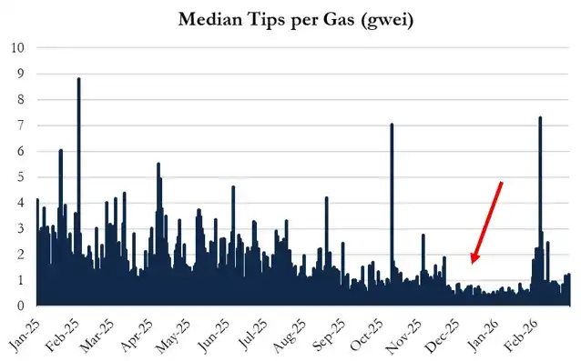 Furthermore, the increase in the gas limit has hit Ethereum's validators群体, whose tip income per unit of gas has now decreased by 40%–50%. Falling yields will weaken staking demand and high-value transaction activity, further undermining institutional adoption. This flywheel has now started to reverse.