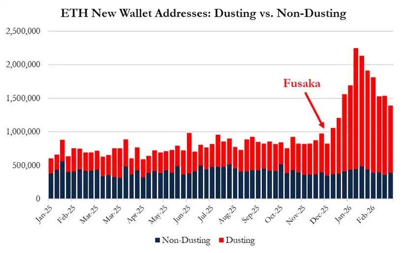 Our comprehensive analysis of on-chain data from January 2025 to February 2026 shows that what Lee calls "activity growth from institutional adoption" can actually be explained by a large number of low-value address poisoning and wallet dusting activities. These activities were triggered by the excess block space after the Fusaka upgrade.