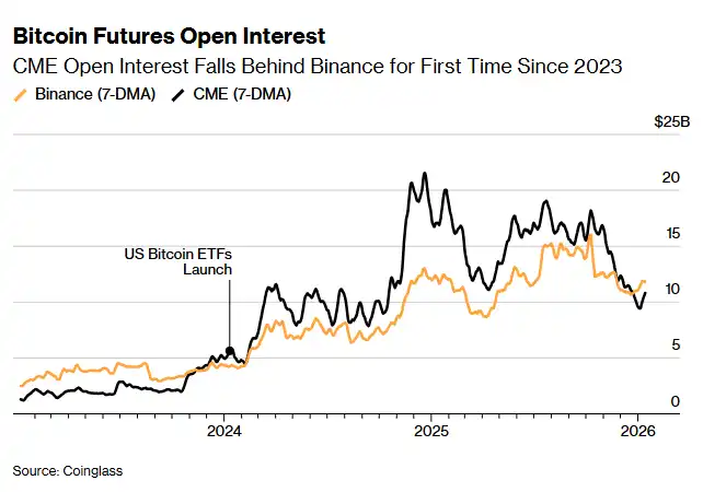 The "cash-and-carry" trade commonly used by institutions—buying bitcoin spot while selling futures to profit from the spread—is collapsing. This not only indicates that arbitrage opportunities are rapidly shrinking but also signals a deeper change in the structure of the crypto market. The open interest in Bitcoin futures on the Chicago Mercantile Exchange (CME) has fallen below that of Binance for the first time since 2023, further illustrating that as spreads narrow and market access becomes more efficient, the highly profitable arbitrage opportunities of the past are being rapidly eroded.
