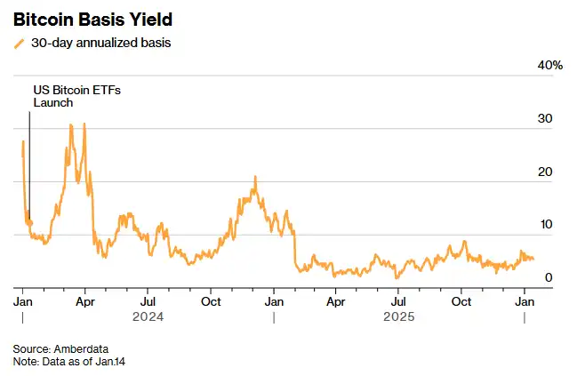 According to data compiled by Amberdata, the annualized yield for a one-month tenure is currently hovering around 5%, near recent lows. Greg Magadini, head of derivatives at Amberdata, said that around this time last year, the basis was close to 17%, but has now fallen to about 4.7%, barely enough to cover the threshold of funding and execution costs. Meanwhile, the one-year US Treasury yield is around 3.5%, making the trade's appeal fade quickly.