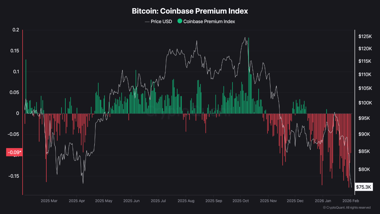Bitcoin bước vào cuối tuần dưới áp lực bán mạnh mẽ, mất quyết định ngưỡng hỗ trợ 80.000 USD và trượt xuống vùng 74.000 USD lần đầu tiên kể từ tháng 4 năm 2025. Động thái này làm gia tăng lo ngại rằng thị trường không còn trong giai đoạn tạm dừng điều chỉnh mà thay vào đó đang chuyển sang một giai đoạn giảm giá rộng hơn. Sự yếu kém về giá trùng khớp với các tín hiệu nhu cầu phai nhạt, đặc biệt là từ các nhà đầu tư có trụ sở tại Mỹ, một động lực hiện đang nổi bật rõ ràng trong dữ liệu on-chain.