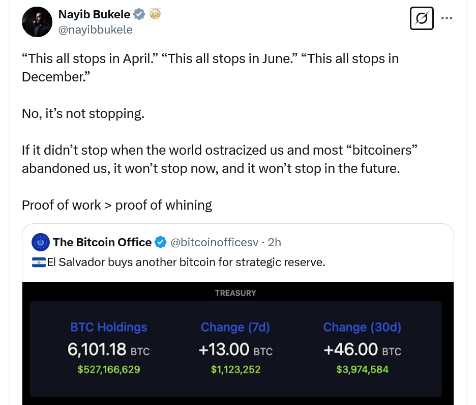 Bukele didn’t walk back his orange-pilled position entirely. In March, despite several requests from the IMF that El Salvador cease its Bitcoin purchases, El Salvador steamed ahead. Bukele wrote on X at the time: