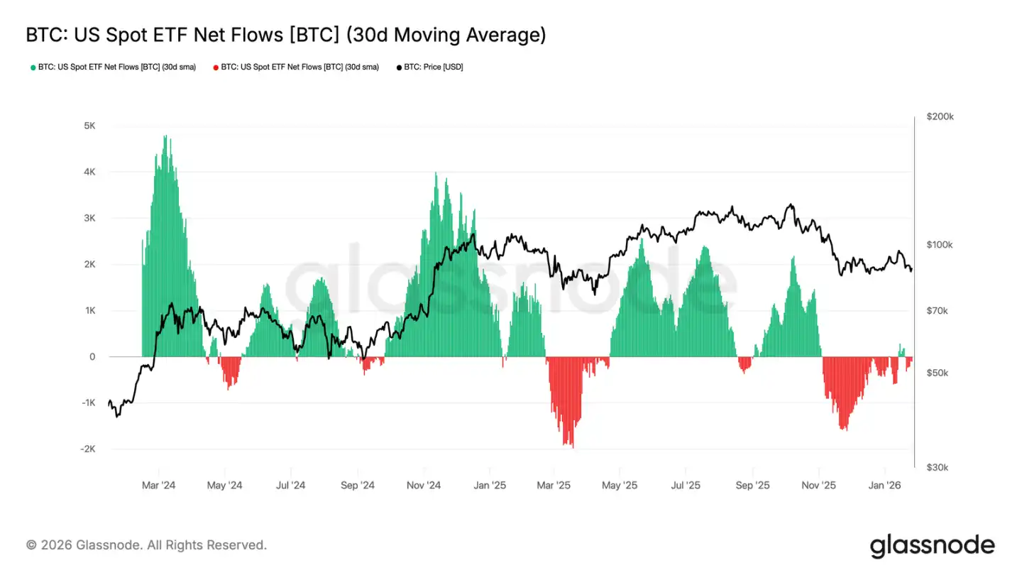 Net flows for US spot Bitcoin ETFs have returned to balance. After a prolonged period of net outflows, their 30-day moving average has approached the neutral line. This indicates a significant easing of structural selling pressure from ETFs.