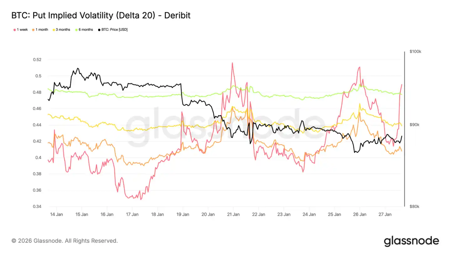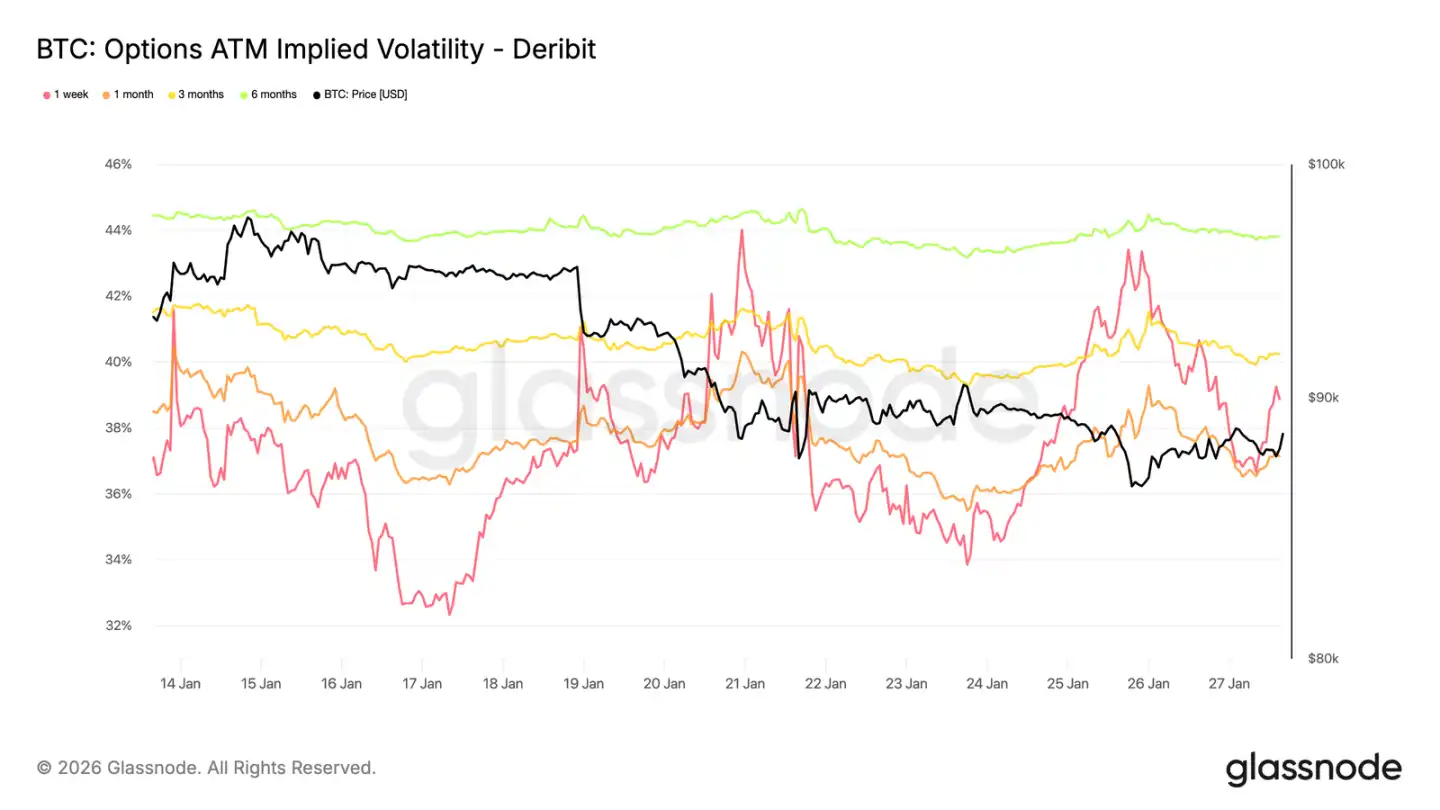 Short-term ATM implied volatility spiked sharply over the weekend, reflecting increased market sensitivity to the broader short-term risk environment (not just crypto-specific factors).