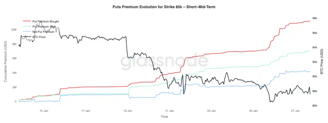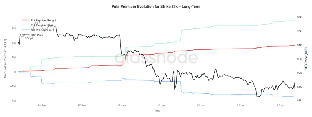 Focusing on premium changes for $85k strike puts reveals a term structure divergence: net premium buying dominates for tenors under 3 months, driving net premium higher; tenors beyond 3 months show net premium selling.
