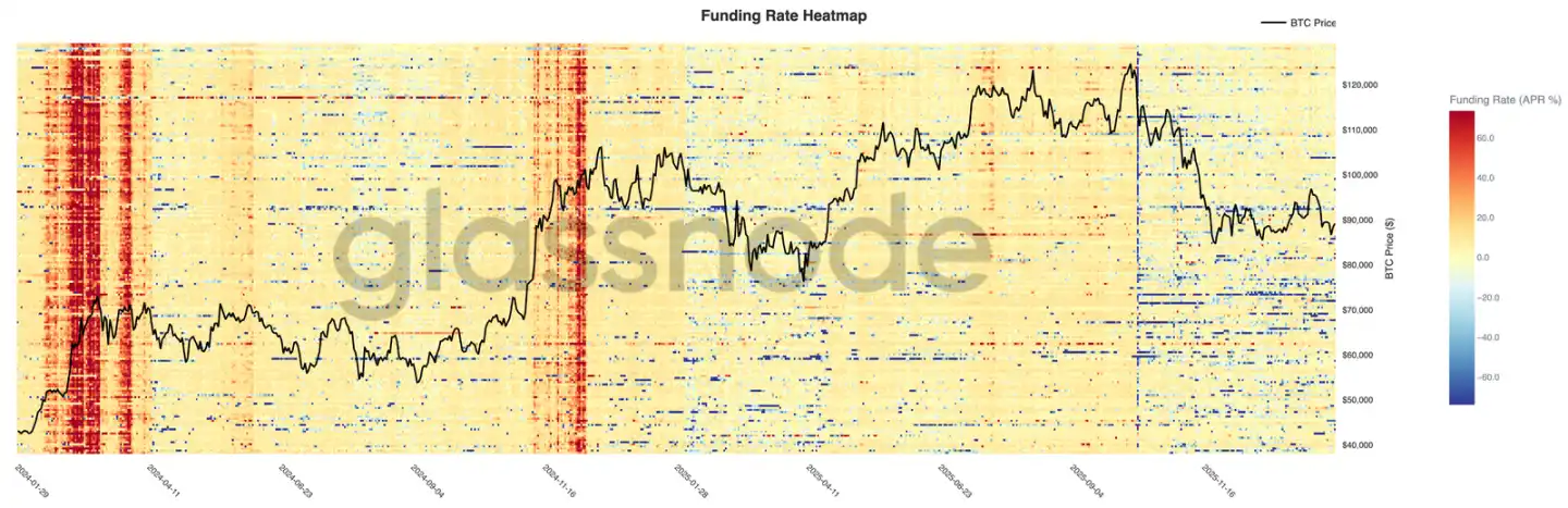Perpetual funding rates across exchanges remain mostly neutral, despite significant price volatility. This indicates leverage has been cleaned out, with long and short positions relatively balanced, and neither side consistently paying high funding.