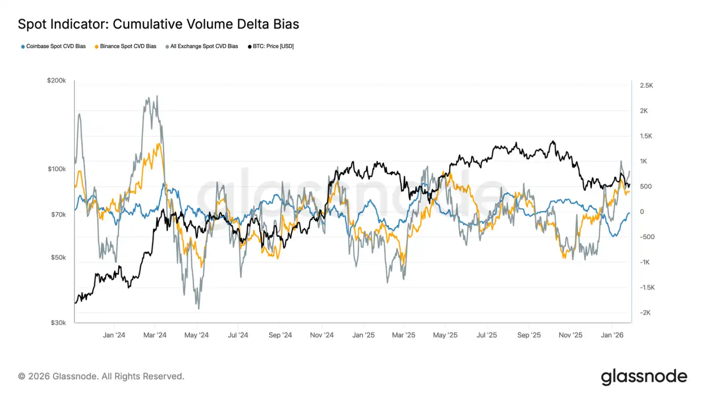 Spot CVD bias across major exchanges is rising, showing a return of buying pressure after a long slump. Binance is leading the rebound, recovering sharply from deeply negative levels; the aggregated CVD bias across all exchanges has also turned positive.