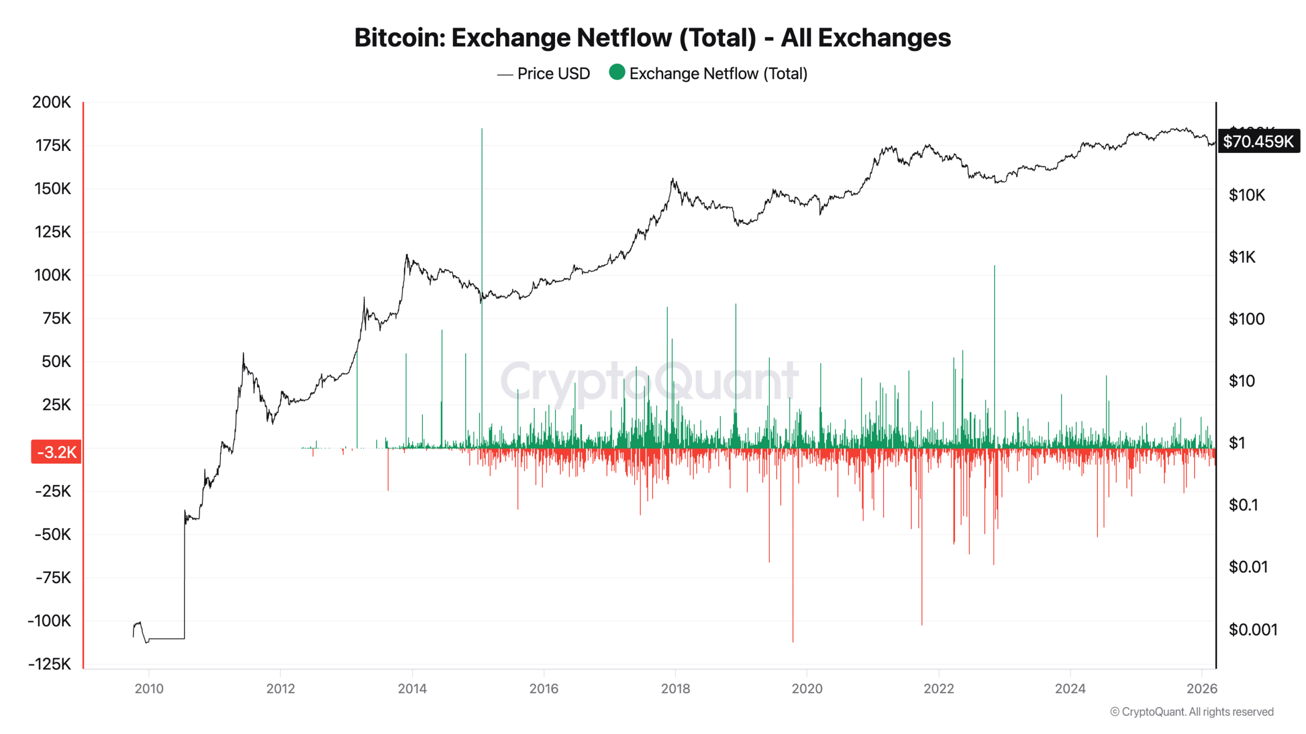 交易所持续呈现资金净流出态势,表明投资者仍在将比特币转移出交易所进行囤积。