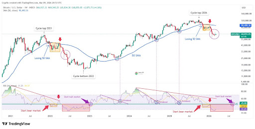 A similar sequence is now visible following the projected 2026 cycle top. According to @_cryptflow_ on X, Bitcoin recently moved beneath the 50-week SMA after peaking earlier in the cycle. This indicator has historically served as a major dividing line between sustained bullish momentum and broader downtrends, meaning its loss often signals a shift in the market’s underlying strength.