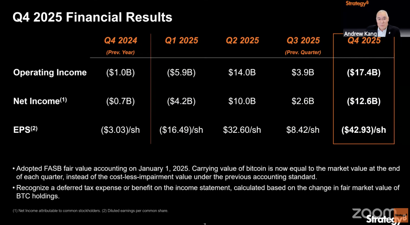 1. Huge paper losses under fair value accounting: In Q4 2025, Strategy's operating loss reached a staggering $17.4 billion, with a net loss of $12.4 billion. This is mainly due to the new fair value accounting standard adopted by the company starting January 1, 2025. According to this standard, the company must re-evaluate all Bitcoin holdings at market price at the end of each quarter, and price fluctuations are directly included in the income statement. The continuous correction in Bitcoin's price has turned the shrinkage in holding value directly into paper losses, becoming the most直观 "bearish" factor in the earnings report.