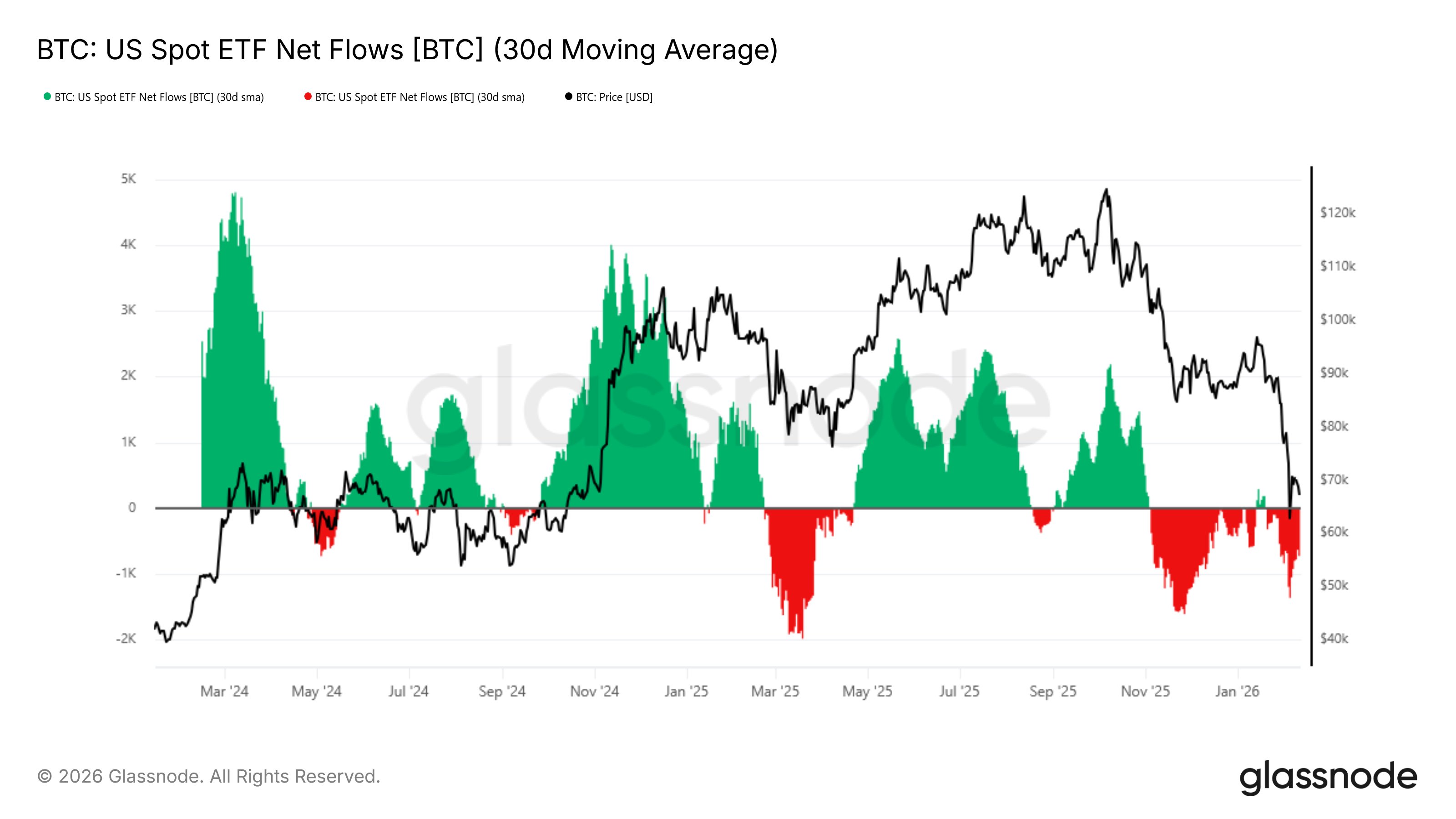 Mặc dù cả quỹ Bitcoin và Ethereum đều đã tận hưởng dòng tiền vào ròng trong phần lớn thời gian tồn tại của chúng, xu hướng này đã thay đổi gần đây. Đầu tiên, đây là biểu đồ về dòng tiền ròng ETF spot Hoa Kỳ của BTC được Glassnode chia sẻ, cho thấy xu hướng trong giá trị SMA 30 ngày của nó trong vài năm qua: