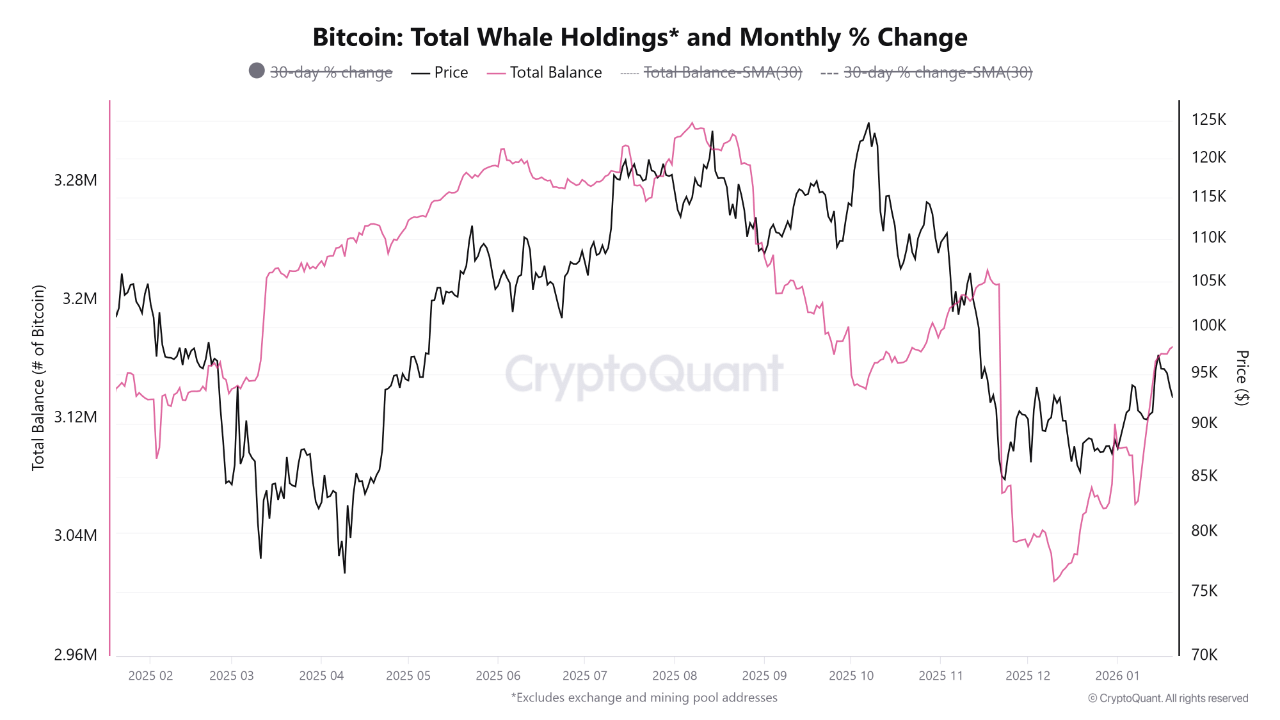 However, a CryptoQuant report suggests the underlying structure has not broken down. Even after geopolitical risks intensified and broader risk appetite deteriorated, whale holdings have not declined on a monthly basis.