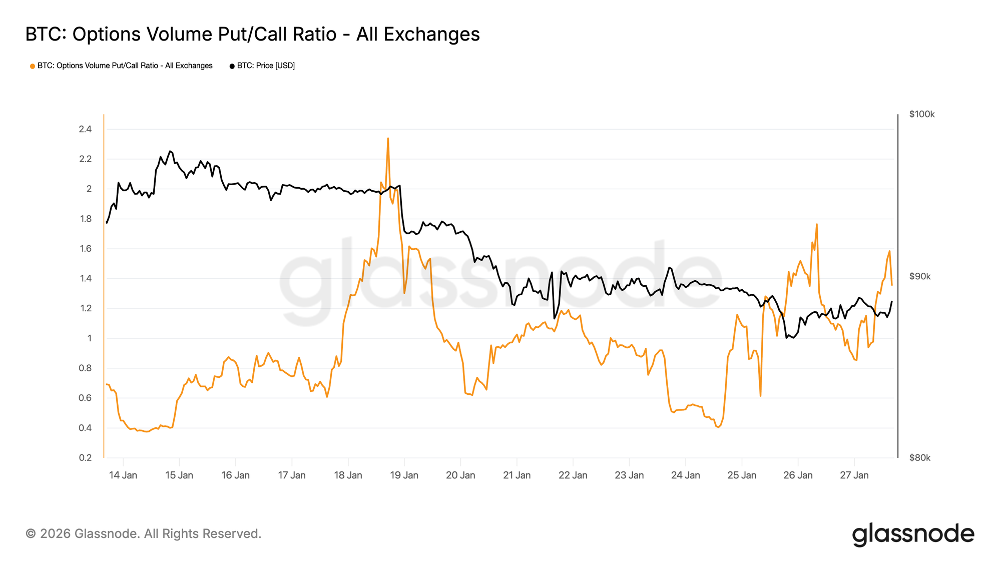 En se tournant vers les flux, le ratio put-call du volume des options confirme cette posture défensive. L'activité des puts a augmenté par rapport aux calls, mais sans les pics de volume typiquement associés à une couverture de panique.
