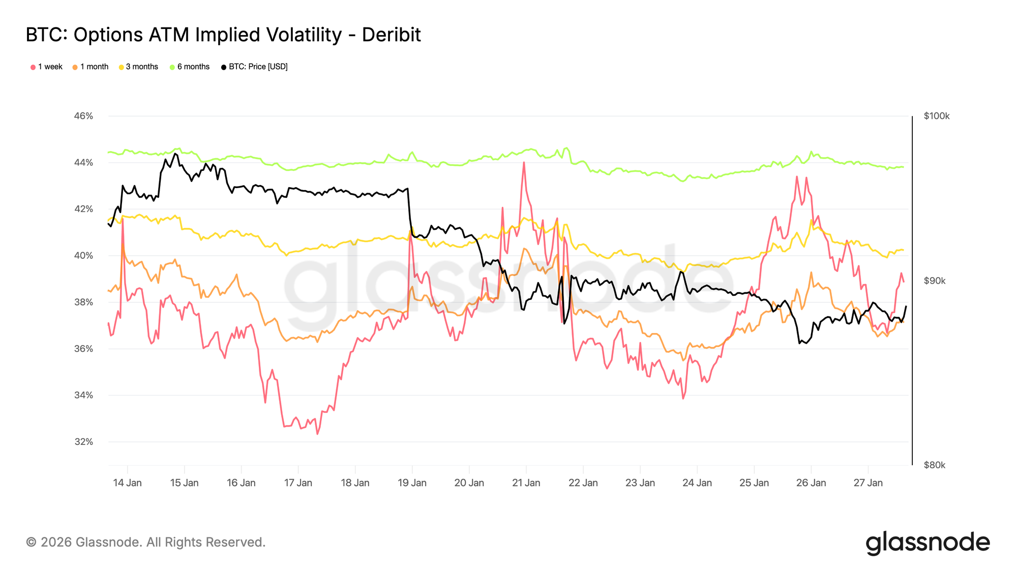 Ce week-end, la volatilité implicite à court terme (ATM) s'est fortement reprisée, reflétant une sensibilité accrue à l'environnement de risque à court terme plutôt qu'à un stress spécifique aux crypto-monnaies.