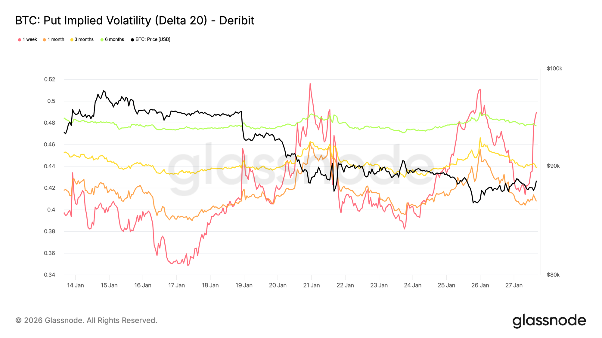 Cette scission reflète un marché répondant à la dérive du Bitcoin de la fourchette du milieu des 90k$ vers la région des hauts 80k$ en se couvrant contre la baisse à court terme, tout en restant à l'aise pour vendre une protection à plus long terme. La structure indique une prudence à court terme sans détérioration plus large des attentes de risque à long terme.