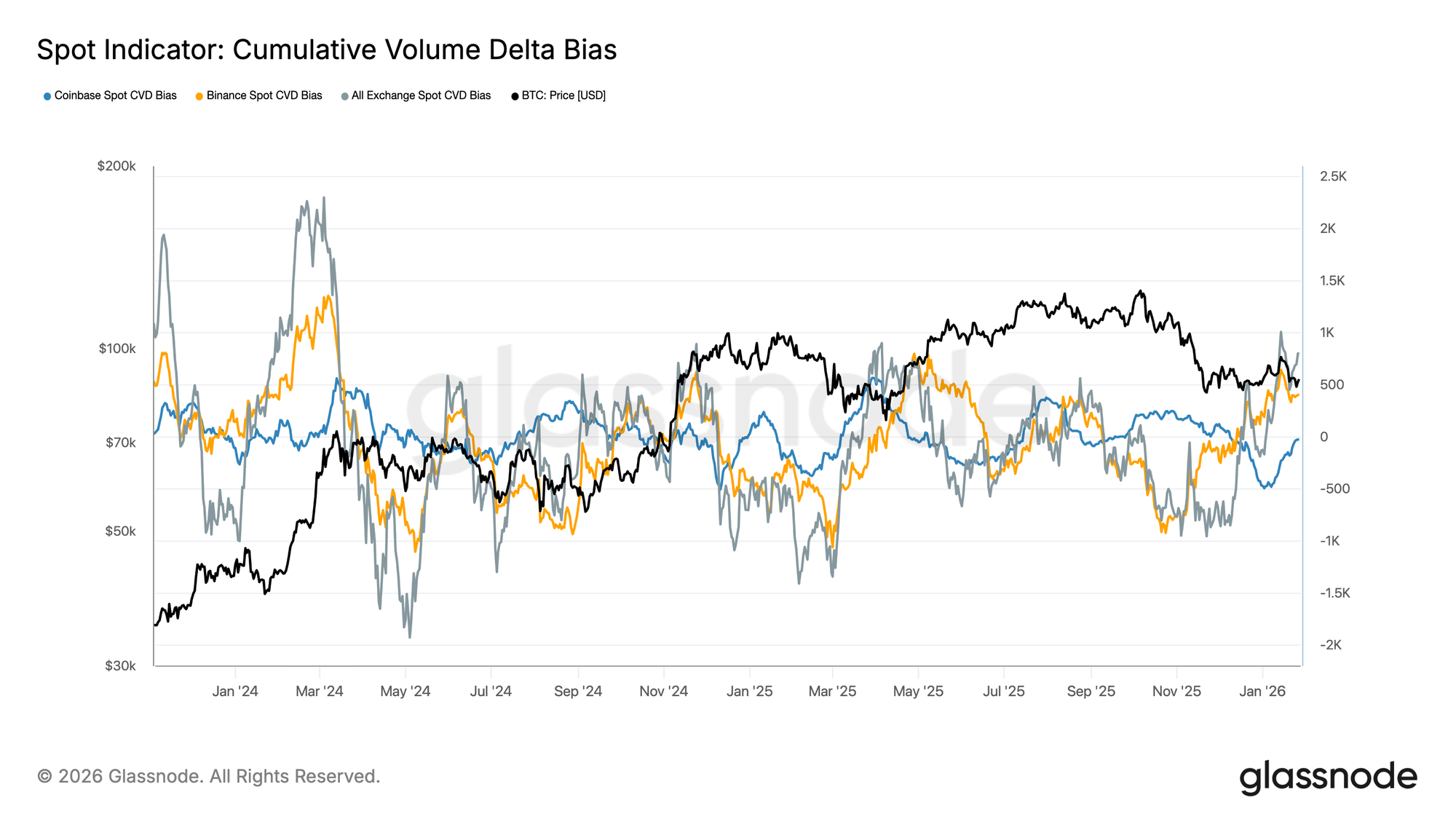 Le biais du CVD au comptant augmente sur les principales places, signalant une nouvelle inclination vers la pression d'achat du marché après une période prolongée de demande modérée. Binance a mené le rebond, se redressant brusquement après un territoire profondément négatif, tandis que le biais agrégé (toutes places confondues) repousse également en territoire positif.