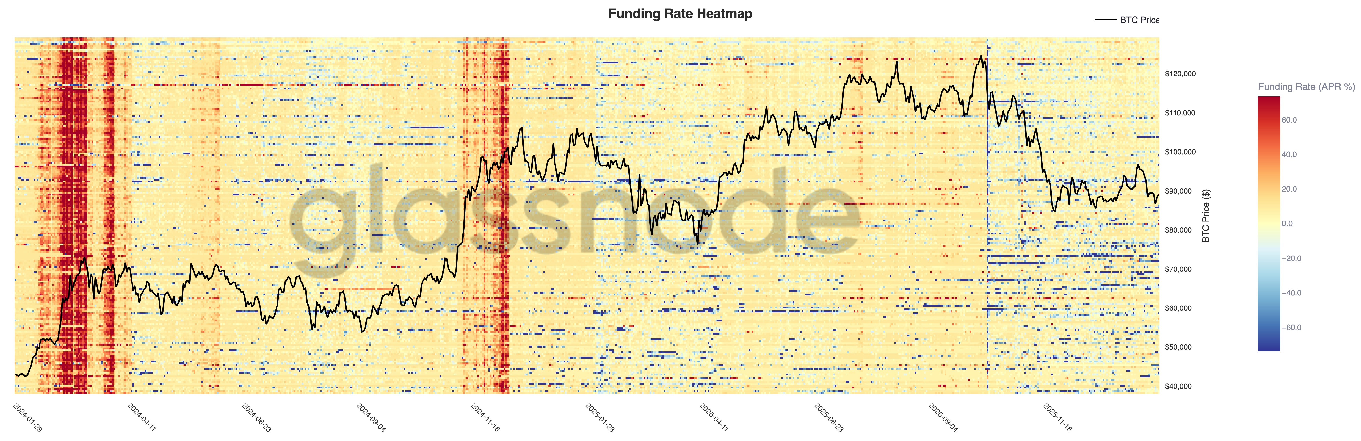 Les conditions de financement perpétuel restent largement modérées sur toutes les places, la majorité de la surface étant proche du neutre malgré une volatilité des prix élevée. Cela suggère que l'effet de levier a été éliminé et que le positionnement est maintenant plus équilibré, ni les longs ni les shorts ne payant constamment une prime significative pour maintenir leur exposition.