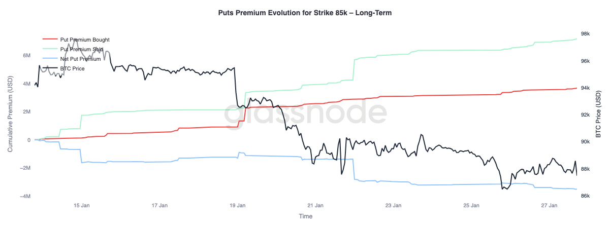 Un zoom sur l'évolution de la prime des puts au strike de 85K révèle deux comportements distincts à travers les échéances. À court et moyen terme, jusqu'à trois mois, la prime des puts achetée a clairement dominé la prime vendue, poussant la prime nette des puts plus haut.