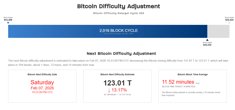 The next such adjustment is scheduled to occur tomorrow, February 6th. According to data from CoinWarz, the network will reduce the Difficulty during this event.