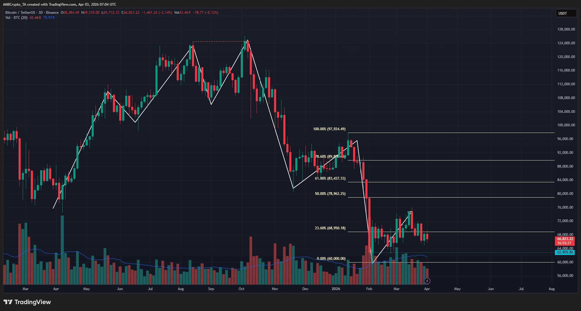 Consider the price action since February. The $60k swing low resulted in a bounce that has not climbed above the 50% retracement level.