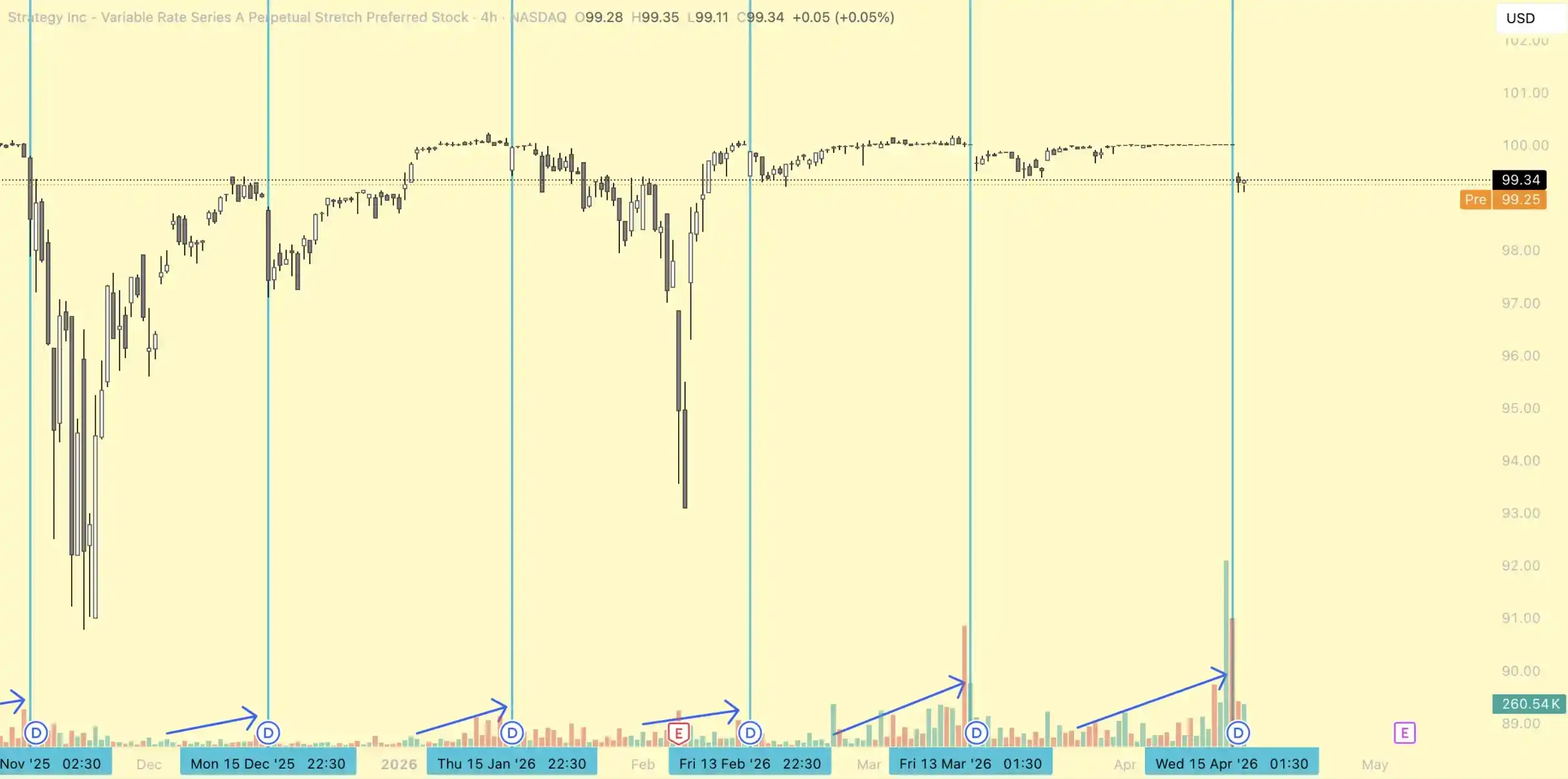As shown in the chart, trading volume begins to climb about a week before the ex-dividend date, peaks on or the day before the ex-dividend date, and quickly subsides afterward. The surge in volume in April was significantly steeper than in March, indicating that more and more capital is participating in STRC's ex-dividend arbitrage.