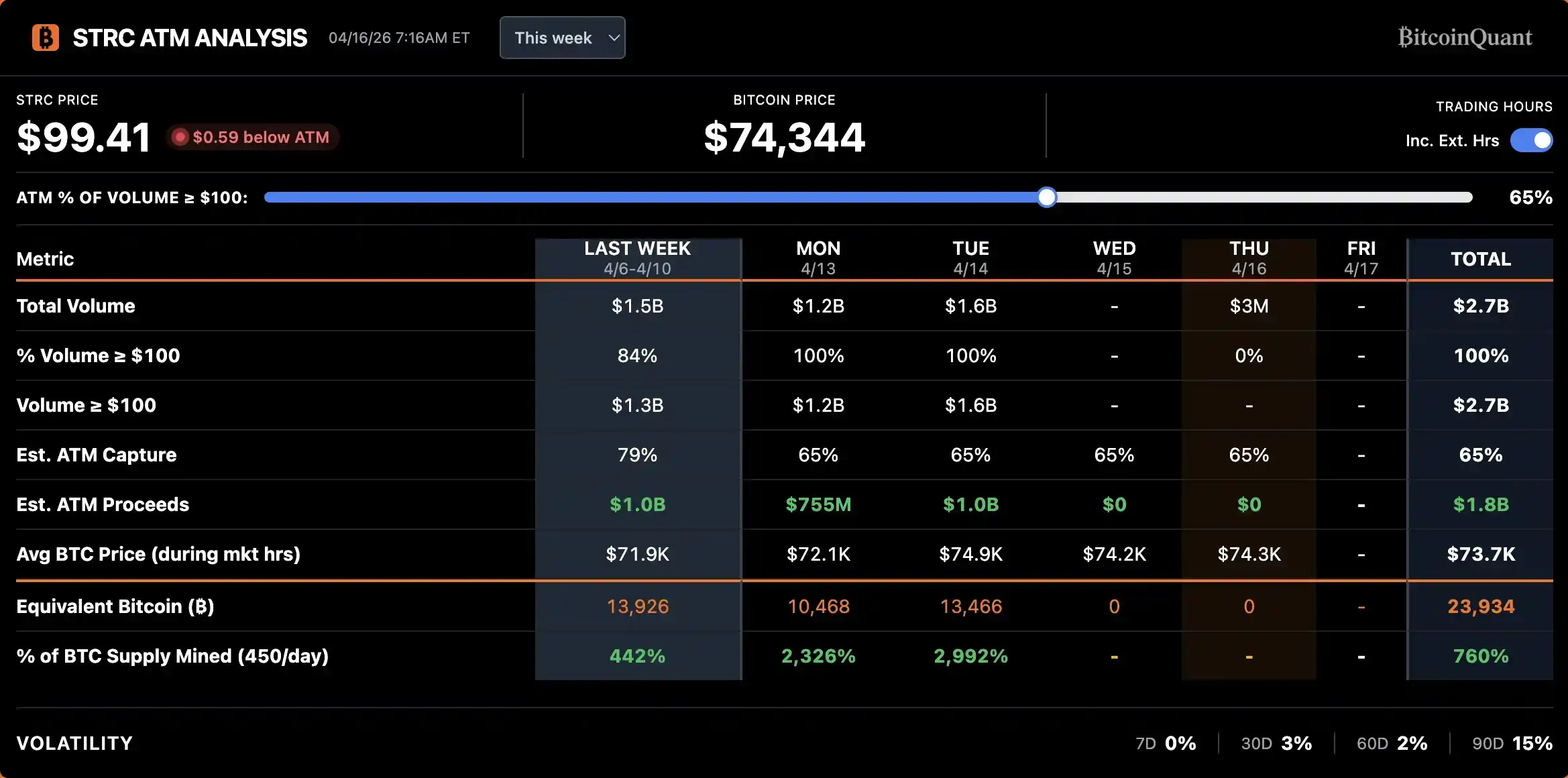 On April 14th, Strategy raised approximately $1 billion through STRC in a single day. With a 3x magnification, this corresponds to about $3 billion in BTC buying pressure, neatly matching the scale of BTC acquisitions in the first two weeks of April before the ex-dividend date.