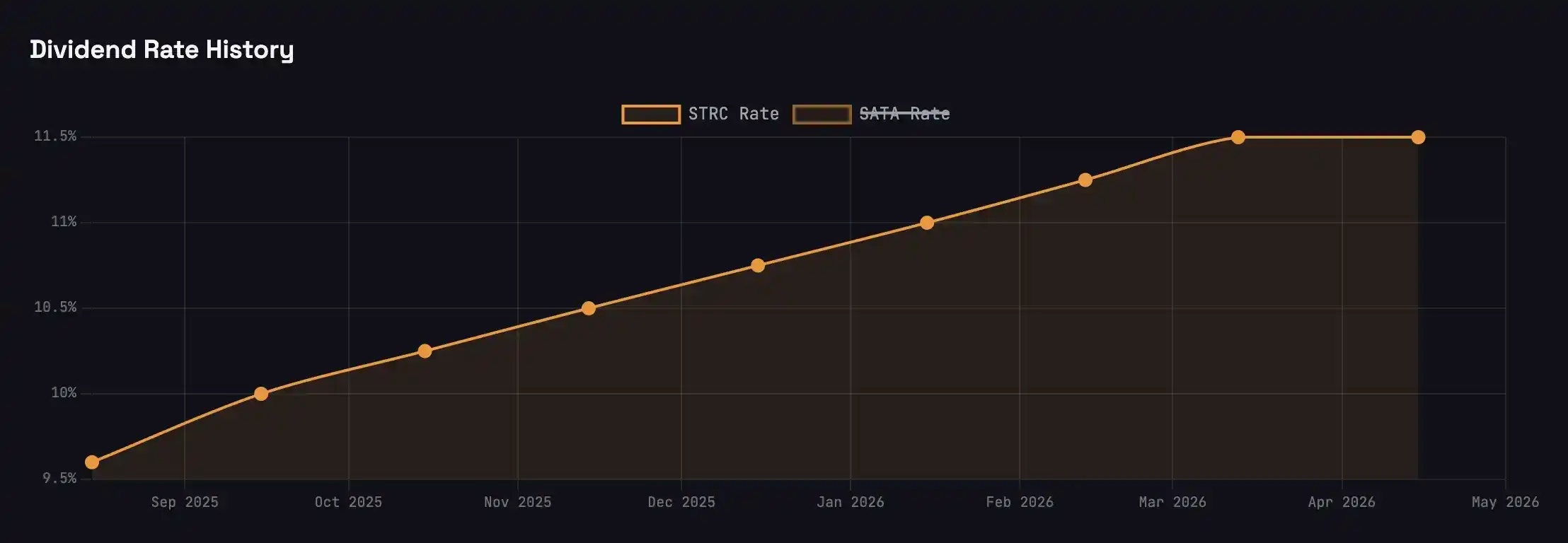 When BTC falls, the collateral shrinks, STRC's credit risk increases, and Strategy must raise the dividend rate to compensate for the new risk level. But the higher the dividend rate, the greater the cash flow pressure and the higher the probability of default. This is an unstable feedback loop. During the period last October when BTC halved from $120,000 to $60,000, the STRC dividend rate was raised from 7% all the way to 11.5% to barely pull buying interest back.