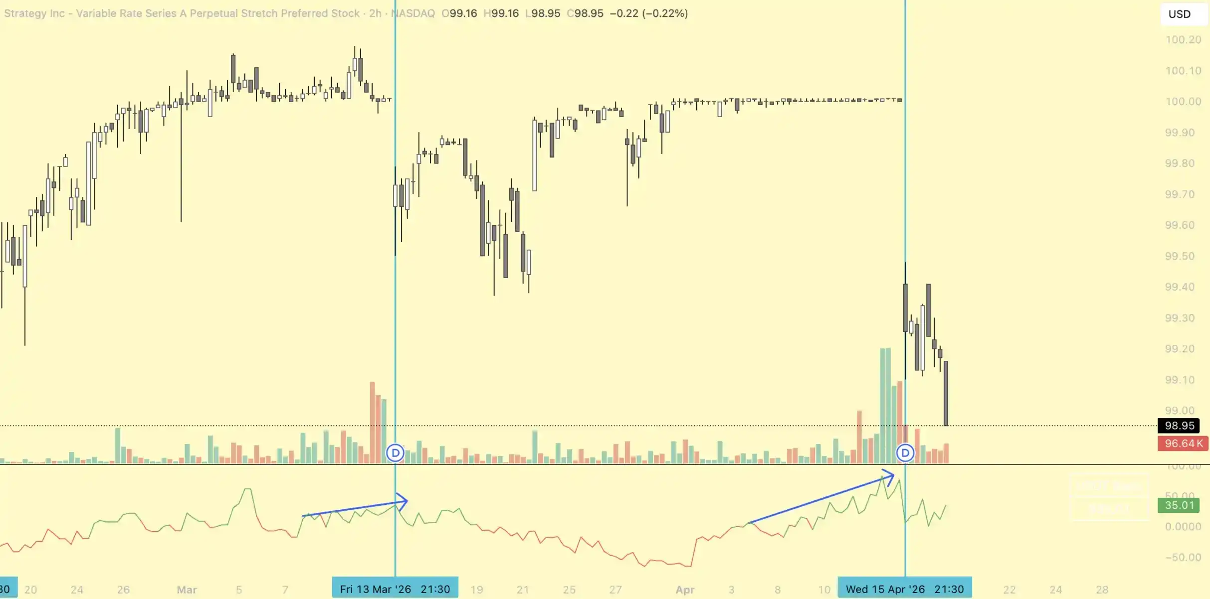 For the STRC product itself, the two or three weeks after the ex-dividend date enter a "dead zone"—liquidity shrinks, bid-ask spreads widen, and the share price remains below the $100 par value for extended periods. This repeated de-anchoring erodes STRC's positioning as a "money market product," pushing it towards a form more akin to a monthly volatile bond.